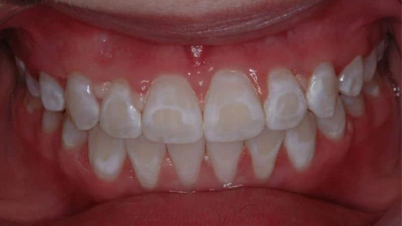 La fluorosis es una condición intrínseca causada por ingerir demasiado fluoruro mientras se desarrollan los dientes permanentes. Esto pasa, por ejemplo en niños que consumen agua con altísimo contenido de flúor o utilizan pasta dental fluorada en exceso a temprana edad. La fluorosis dental provoca manchas internas que pueden verse como manchas blancas opacas y, en casos más avanzados como manchas de color amarillo marrón en el esmalte. Estas alteraciones quedan incorporadas al diente y no se quitan con cuidados normales en casa.